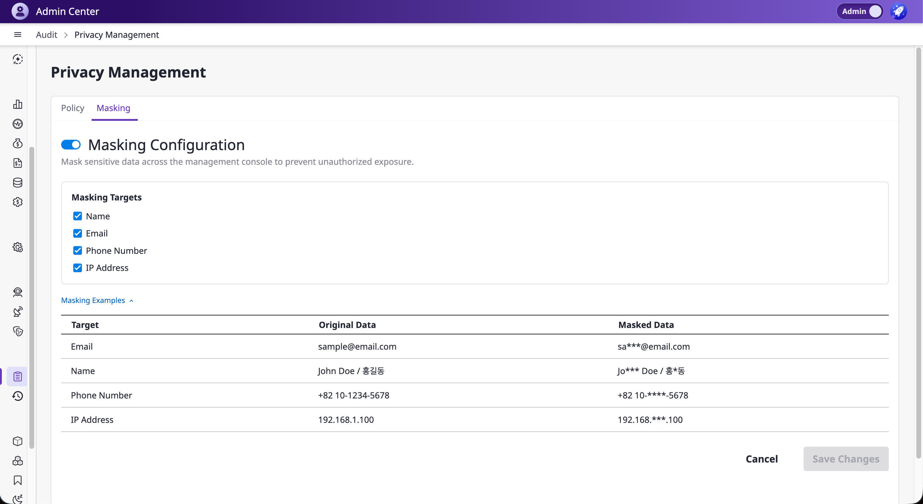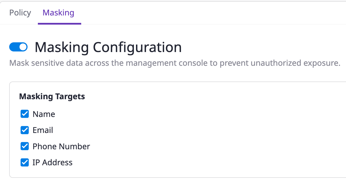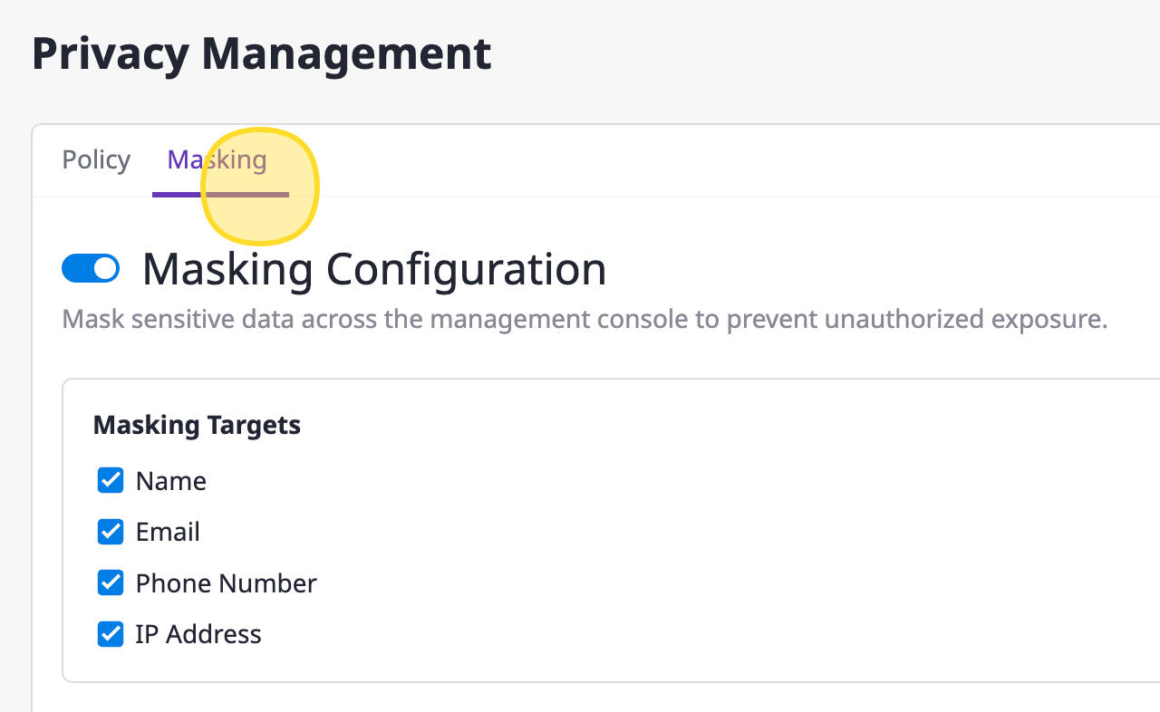 When masking is enabled, sensitive personal information such as names, emails, phone numbers, and IP addresses are partially hidden across specific pages.