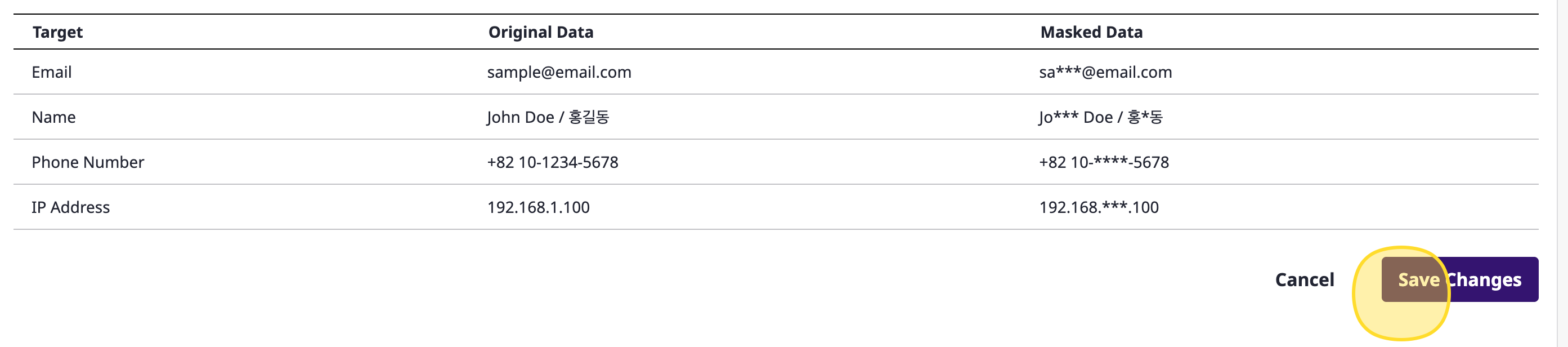 | Phone Number | Masks phone numbers. | +82 10-1234-5678 | +82 10-****-5678 |
